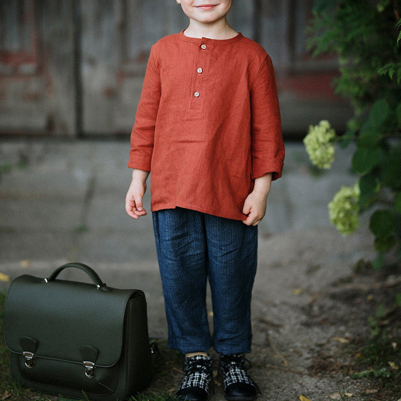 Boy Half-open Collar Long Sleeve Cotton Linen Shirt
