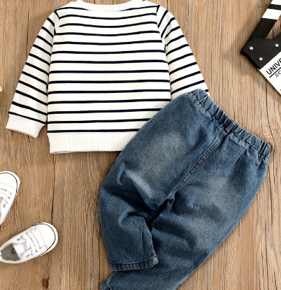 Children's Baby Suit Embroidered Striped Long-sleeved Jeans Suit