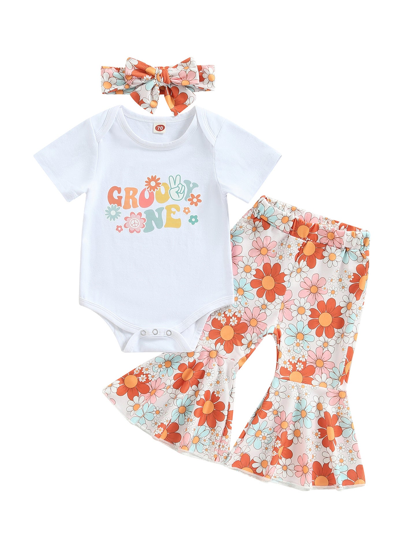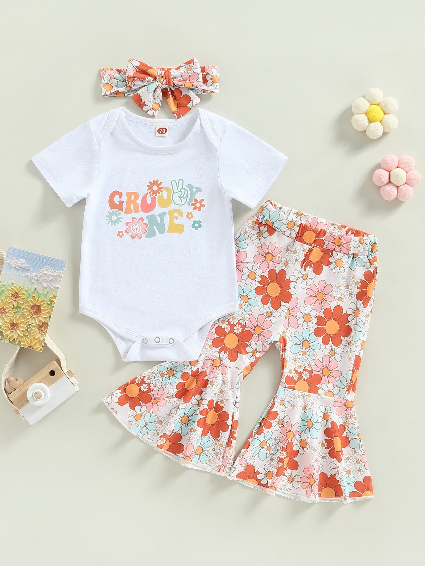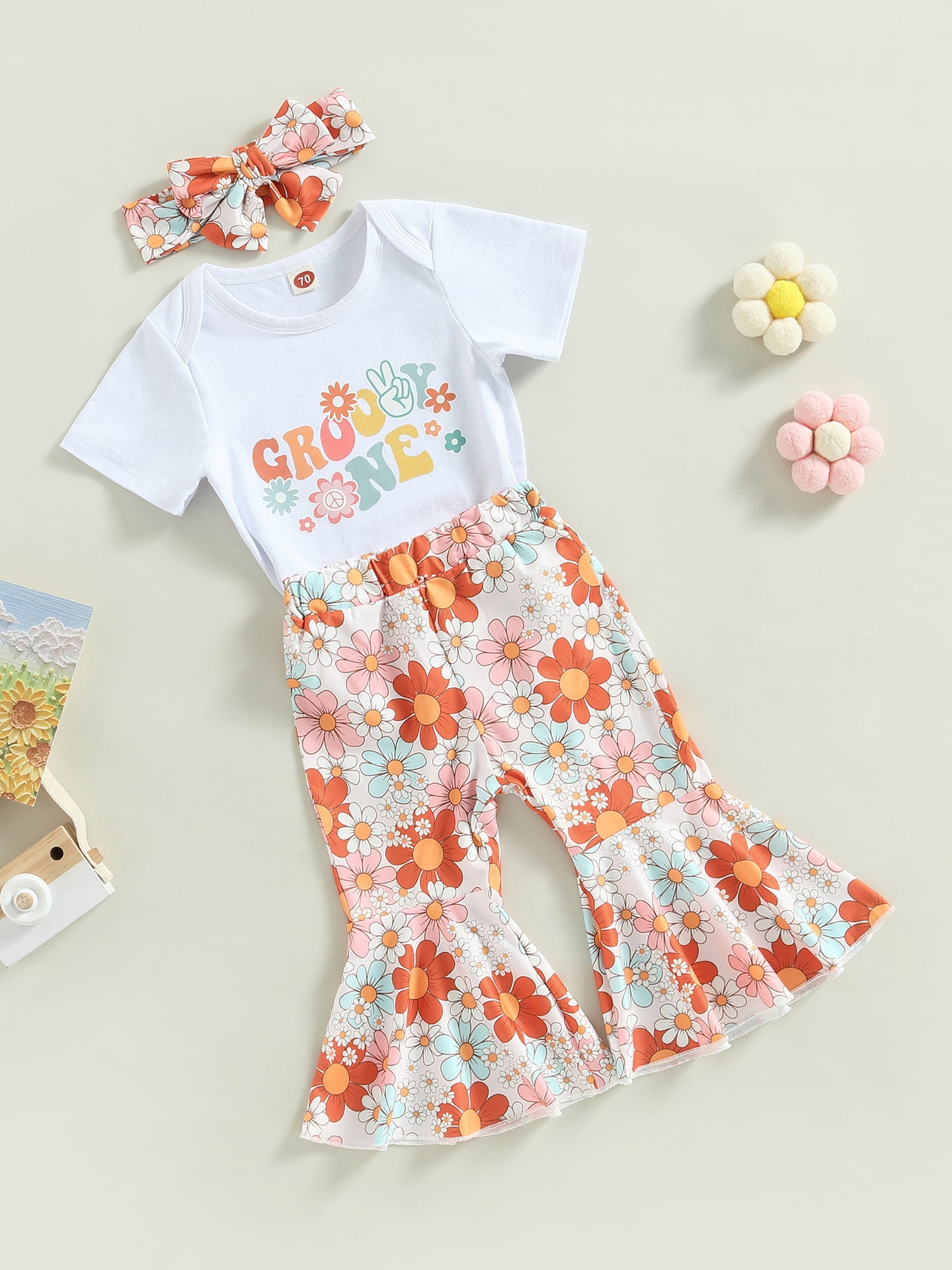 Girls' Rainbow Flower Romper Bell-bottom Pants Headscarf Three-piece Set
