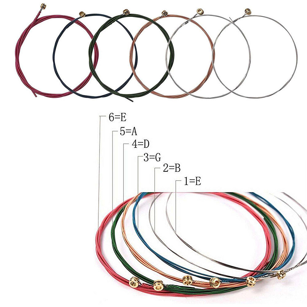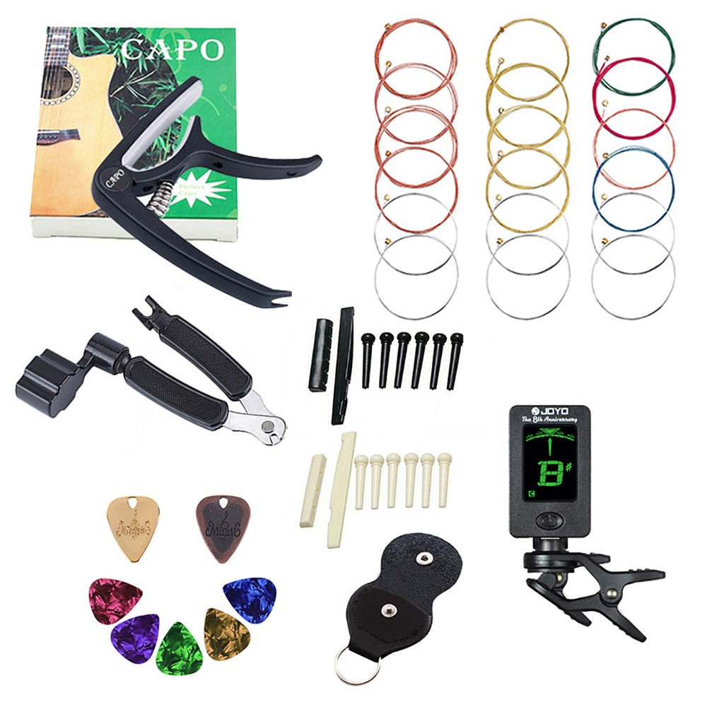 Delivery list: 1x three-in-one cable reel 1x capo (black) 1x tuner (black) 1x leather pick bag (black) 2x metal picks (copper, gold) 3x acoustic guitar strings (yellow) Copper, copper, colored strings) 2x plastic upper Pillow (black x1, white x1) 2x plastic lower pillow (black x1, white x1) 6x plastic black string nails 6x plastic white string nails 5x celluloid pick 071mm ( Random Color)