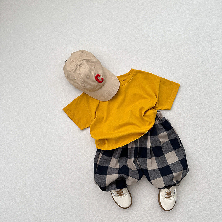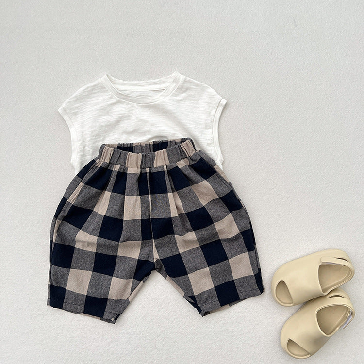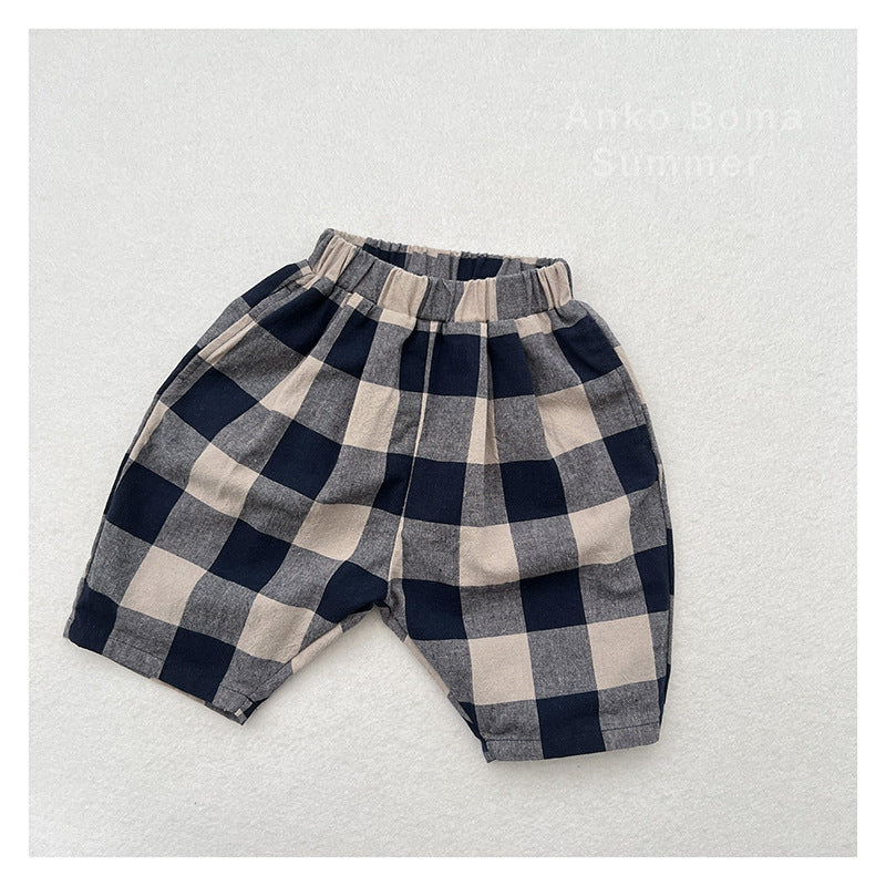 Retro Blue Plaid Casual Capri Pants Children's Middle Pants